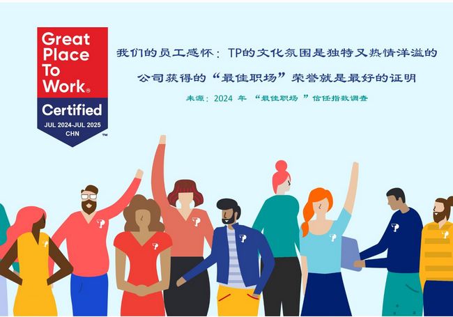 卓越职场全球认可副总裁莎拉•刘易斯-库林表示:“卓越职场认证是一项令人梦寐以求的成就,它需要始终如一地、有意地全面提升员工的工作体验。”她强调,认证是通过员工对公司文化的实时反馈而获得的唯一官方认可。“通过成功获得这一认可,TP显然脱颖而出,成为最适合工作的公司之一,一贯地为员工提供了良好的工作环境。”